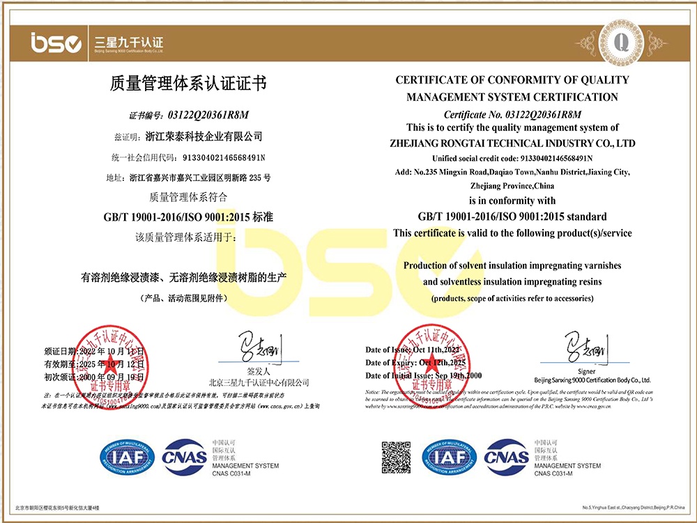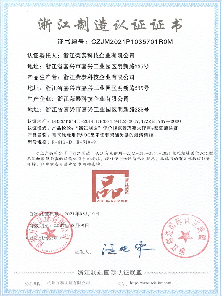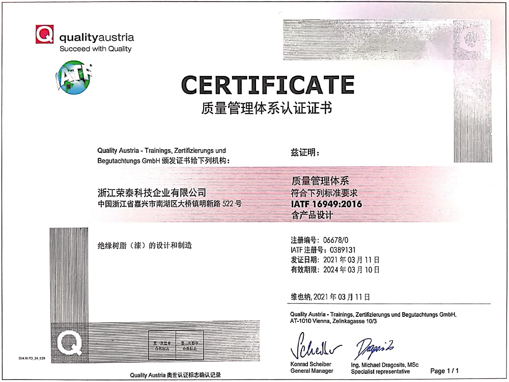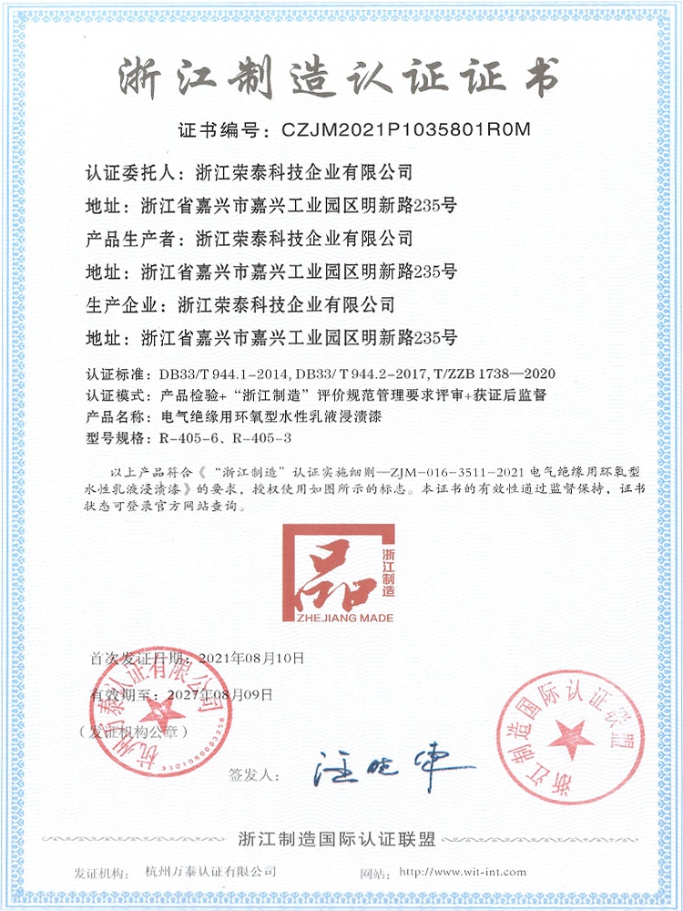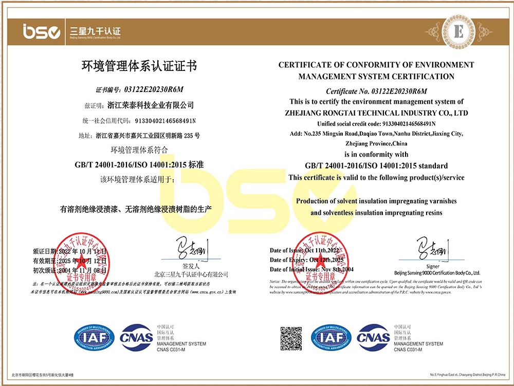 • 浙江榮泰科技企業(yè)有限公司為專業(yè)生產(chǎn)高性能絕緣材料的國家高新技術(shù)企業(yè)、國家“小巨人”企業(yè),為國內(nèi)最大的絕緣漆生產(chǎn)商,全國絕緣材料行業(yè)協(xié)會(huì)的副理事長單位,規(guī)模、產(chǎn)品技術(shù)和創(chuàng)新能力處于同行業(yè)領(lǐng)先地位。